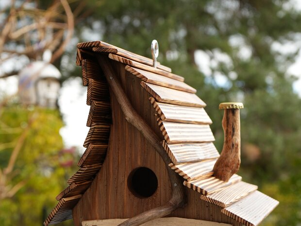 Branche perchoir, cheminée, porte et plaquettes gravées